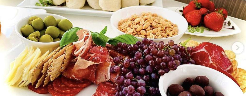 Melon, blueberries, blackberries, grapes, orange, strawberries, mint